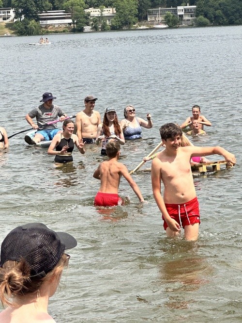 We organized a trip down to the reservoir. It is very close to Stephen and Jennifer's old neighborhood in Bystrc. The kids had to try and build a boat out of foam board and a wooden pallet. This boat had to float and was part of the weekly game of finding the treasure. The Kid's were successful and going to the reservoir was a lot of fun.