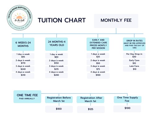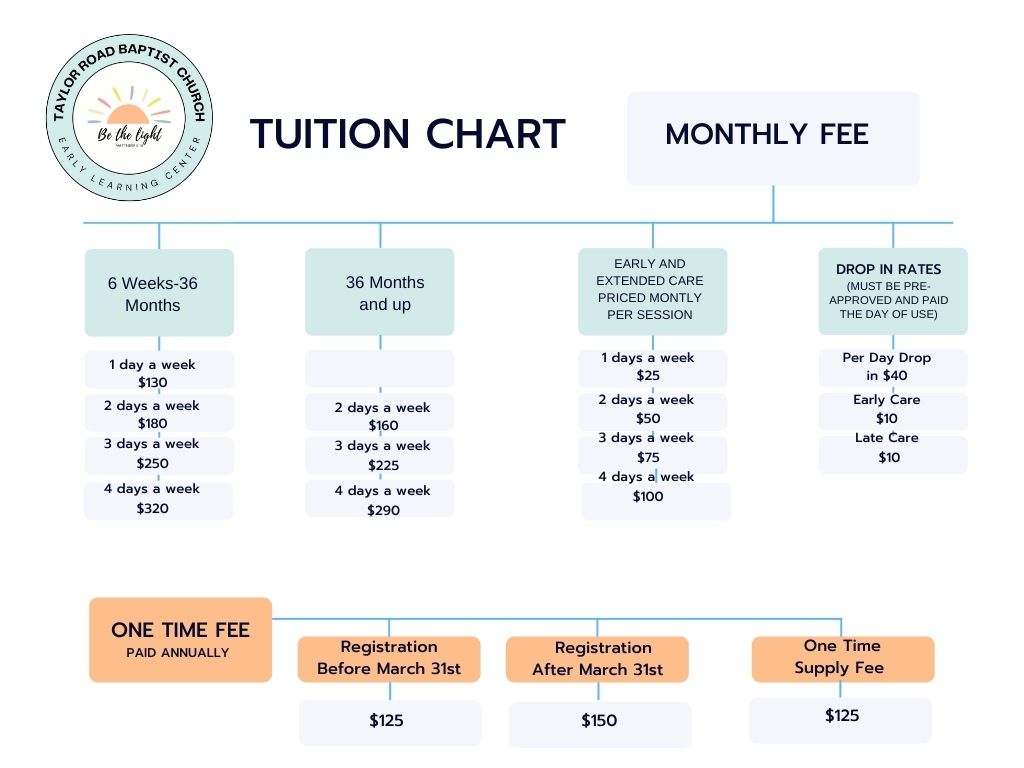 Join us Monday through Thursday, from 9 am to 1 pm for our regular sessions, and for those looking for extended care, we offer early drop-offs at 7:30 am and extended hours until 2:30 pm. Discover a loving community where early learning meets growth, guided by the values of Taylor Road Baptist Church.